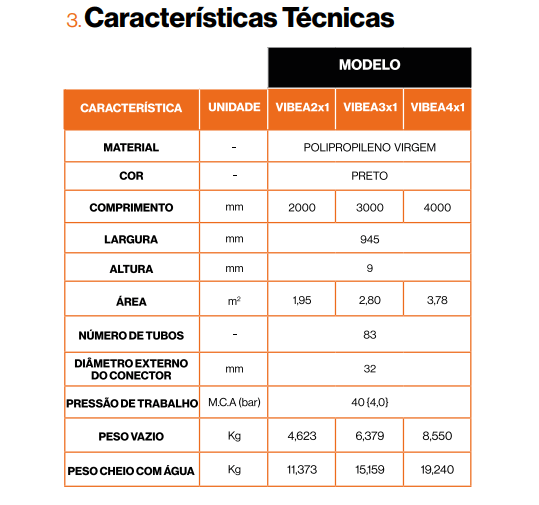 Ficha Técnica: MATERIAL: POLIPROPILENO COR: PRETO COMPRIMENTO (mm) : 3000 LARGURA (mm): 945 ALTURA (mm): 9,00 ÁREA (m²): 2,80 NÚMERO DE TUBOS: 83 DIÂMETRO EXTERNO DO CONECTOR (mm): 32,0 PRESSÃO DE TRABALHO M.C.A (bar): 40 (4,0) PESO VAZIO (kg): 6,379 PESO CHEIO COM ÁGUA (kg): 15,159