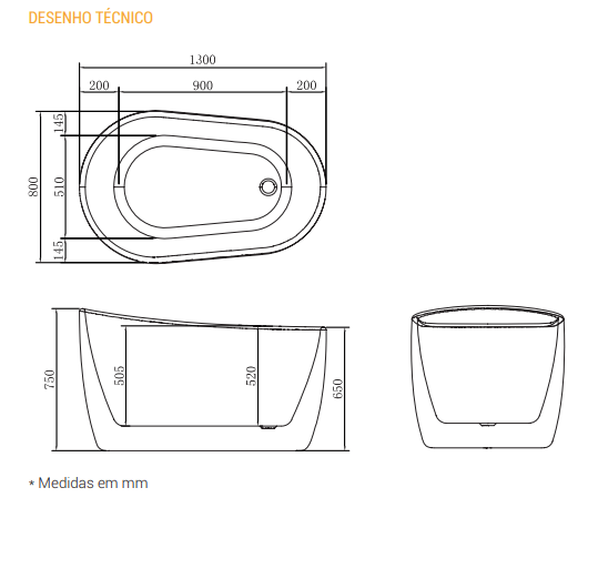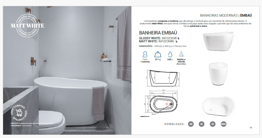 Medidas Disponíveis/ Volume/ Peso: 1,30 (C) x 0,80 (L) x 0,75 (A) - 220 litros - 37 kg Atenção selecionar a cor desejada: GLOSSY WHITE: IM1023GW = Matéria-prima acrílica branca, lisa e brilhante; MATT WHITE: IM1023MW = Matéria-prima acrílica branca, lisa e fosca.