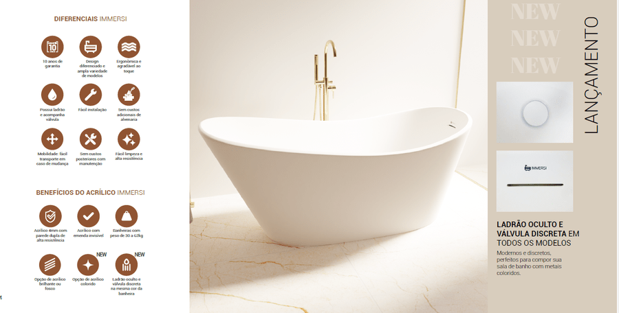 Características: Simples e moderna, a banheira Embaú encanta pelos detalhes, ideal para salas de banho compactas e contemporâneas. Material produzido acrílico, de alta qualidade, resistência e estabilidade que garante linhas precisas, perfeitas, não mancha, não amarela, sem emendas superfície não porosa facilitando a limpeza. Esses modelos não possuem hidromassagem proporcionando um banho ainda mais tranquilo, além de serem uma grande tendência no mercado, auxiliam na composição do design e decoração do seu ambiente, proporcionando sensação de bem-estar e relaxamento. Banheiras de imersão não tem tubulação consequentemente não faz uso de aquecedores, ou seja a água terá que entrar aquecida na banheira através de um sistema residêncial de aquecimento solar ou á gás, utilizando um misturador monocomando. Formato: Oval Acomodações: 1 pessoa Modelo: Imersão Versão: Embaú Marca: Immersi