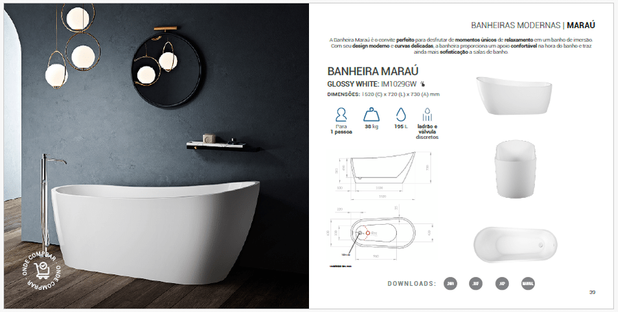 Características: Assim como a maré baixa anuncia o início de mais um belo dia para aproveitar as piscinas naturais e o visual indescritível na Península de Maraú, litoral Sul da Bahia, a Banheira Maraú é o convite perfeito para desfrutar de momentos únicos de relaxamento em um banho de imersão.Com seu design moderno e curvas delicadas, a banheira proporciona um apoio confortável na hora do banho e traz ainda mais sofisticação a salas de banho. Material produzido acrílico, de alta qualidade, resistência e estabilidade que garante linhas precisas, perfeitas, não mancha, não amarela, sem emendas superfície não porosa facilitando a limpeza. Esses modelos não possuem hidromassagem proporcionando um banho ainda mais tranquilo, além de serem uma grande tendência no mercado, auxiliam na composição do design e decoração do seu ambiente, proporcionando sensação de bem-estar e relaxamento. Banheiras de imersão não tem tubulação consequentemente não faz uso de aquecedores, ou seja a água terá que entrar aquecida na banheira através de um sistema residêncial de aquecimento solar ou á gás, utilizando um misturador monocomando. Formato: Oval Acomodações: 1 pessoa Modelo: Imersão Versão: Maraú Marca: Immersi
