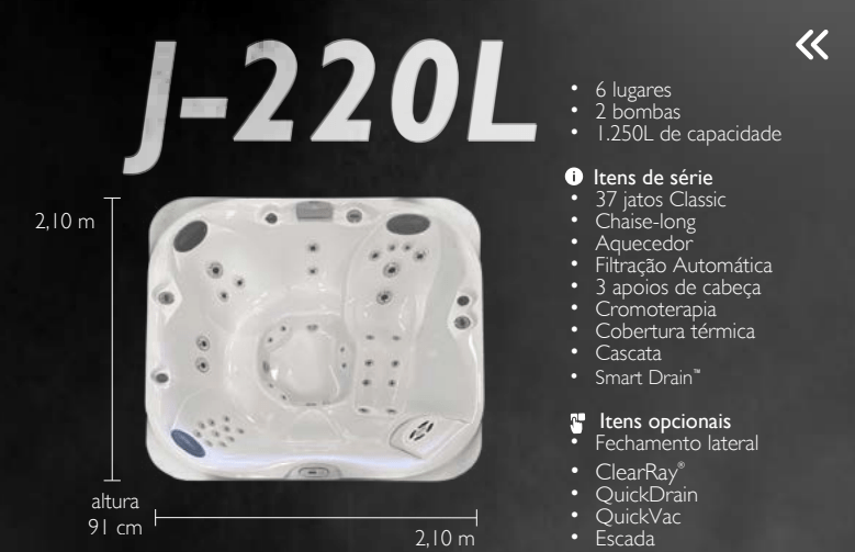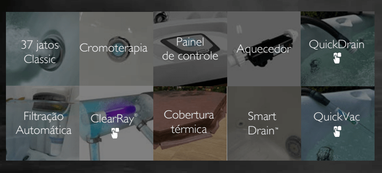 Itens inclusos: 2 Bombas 37 jatos Classic Chaise-long Aquecedor Filtração Automática 3 apoios de cabeça Cromoterapia Cobertura térmica Cascata Smart Drain