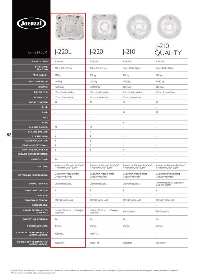 Características: Lançamento da Jacuzzi. Fabricada com a mais alta tecnologia, adequados ao funcionamento tropical e com Jatos de Hidroterapia que vão te fazer esquecer dos problemas do dia-a-dia, estes SPAs vão te mostrar qual o verdadeiro sentido da palavra “relaxar”. Linha: J-FLEX Formato: Quadrado Modelo: J-220L Material: Acrílico Nome: J-220L Marca: Jacuzzi